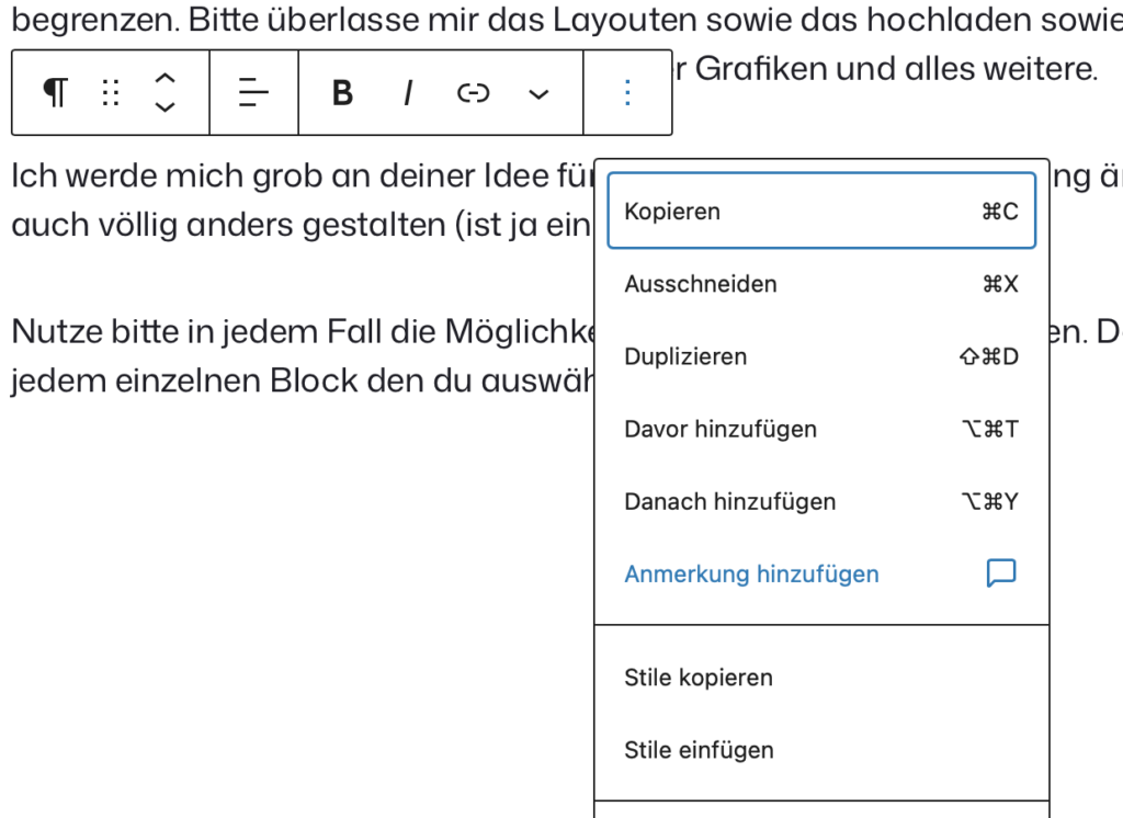 Ich werde in den kommenden Tagen auf der Homepage anfangen mit dem Layout. Auch wenn es dich in den Fingern juckt bitte ich dich, keine Blöcke einzufügen, zu verschieben oder zu löschen. Leider gibt es bei WordPress keine Nutzerrolle die es nur erlaubt Texte zu ändern und Kommentare einzufügen. Auch ohne Adminrechte, kannst du Blöcke einfügen und löschen. Ich bitte dich nur einfach, das nicht zu tun, sondern Änderungswünsche über die Anmerkungen zu kommunizieren.